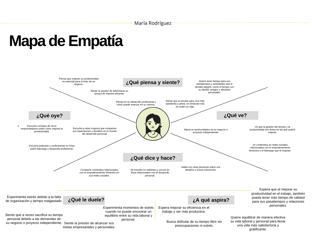 María Rodríguez represents the ideal target as an entrepreneurial and ambitious woman who values her time and seeks to improve her productivity to achieve success in her business or independent project. Her interest in female empowerment and focus on professional development make her highly receptive to an integral productivity program that provides the necessary tools to advance in her work and personal life.
